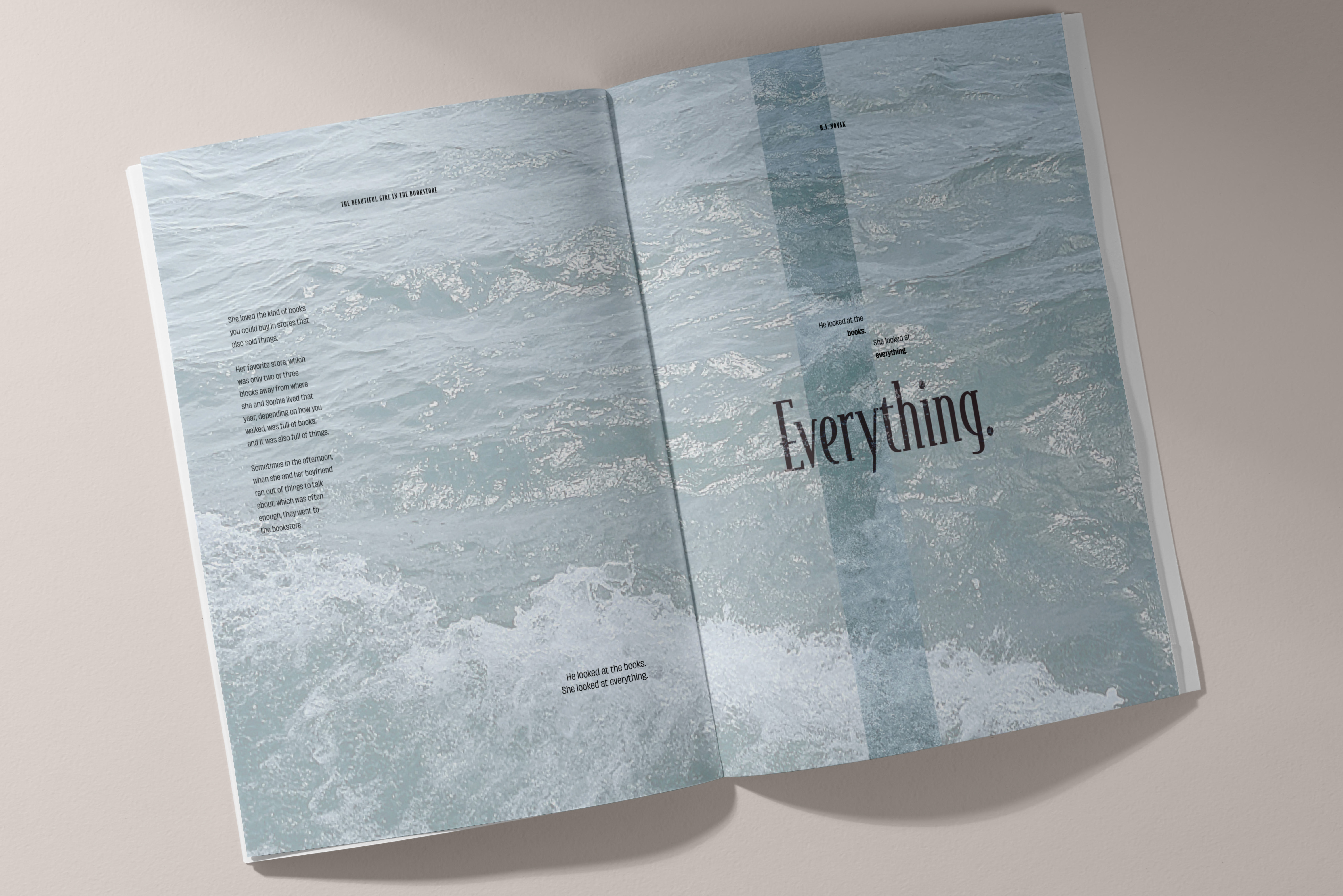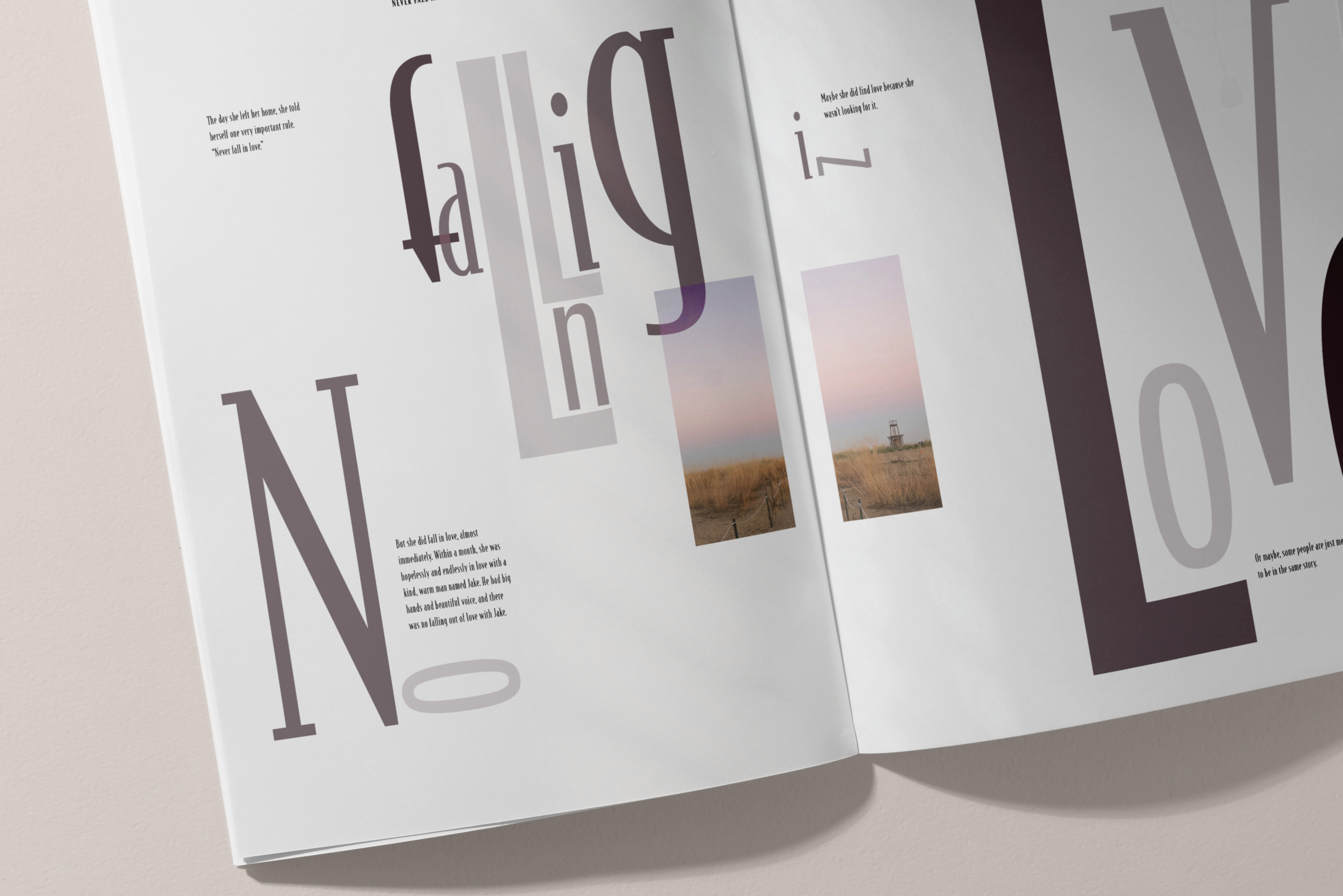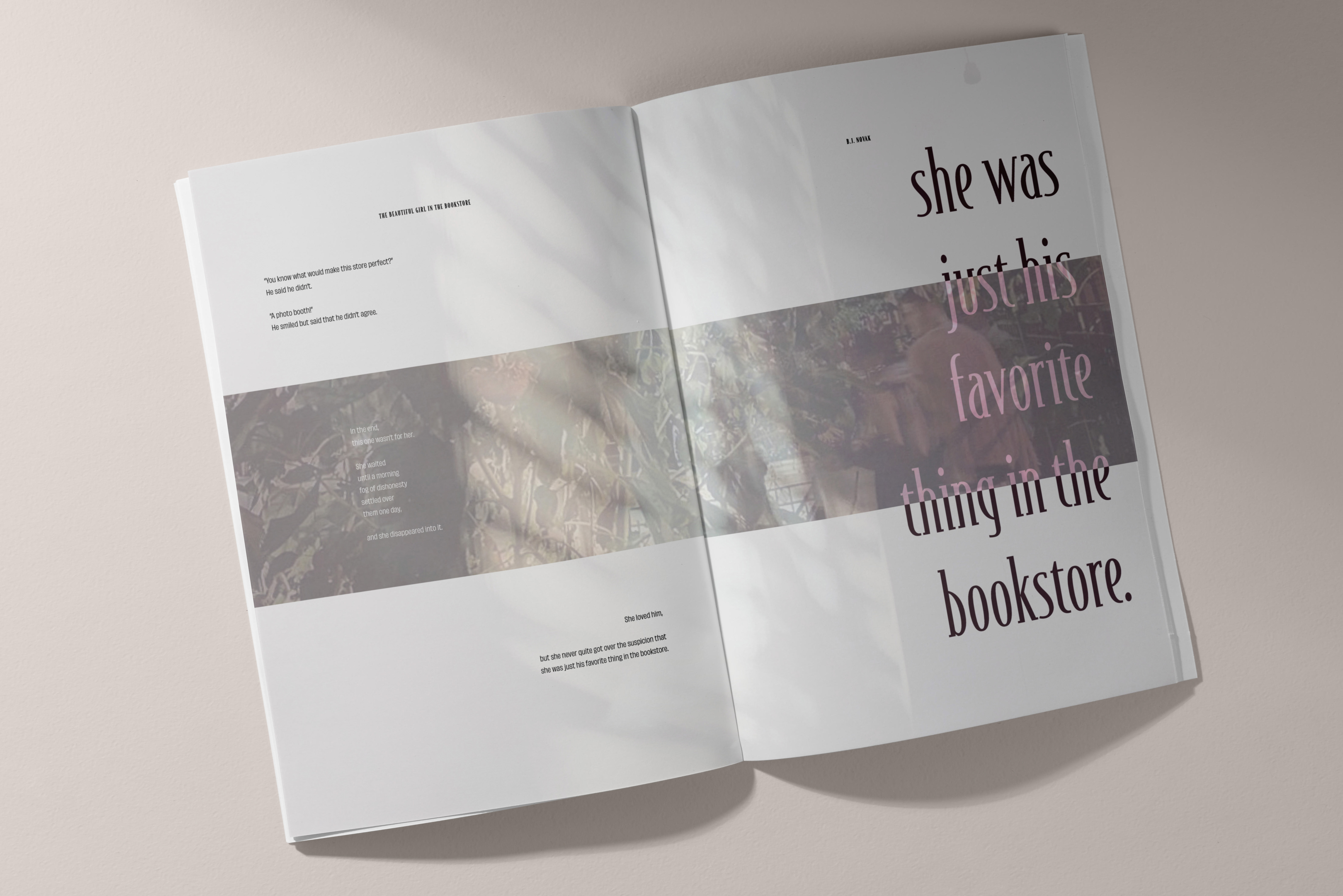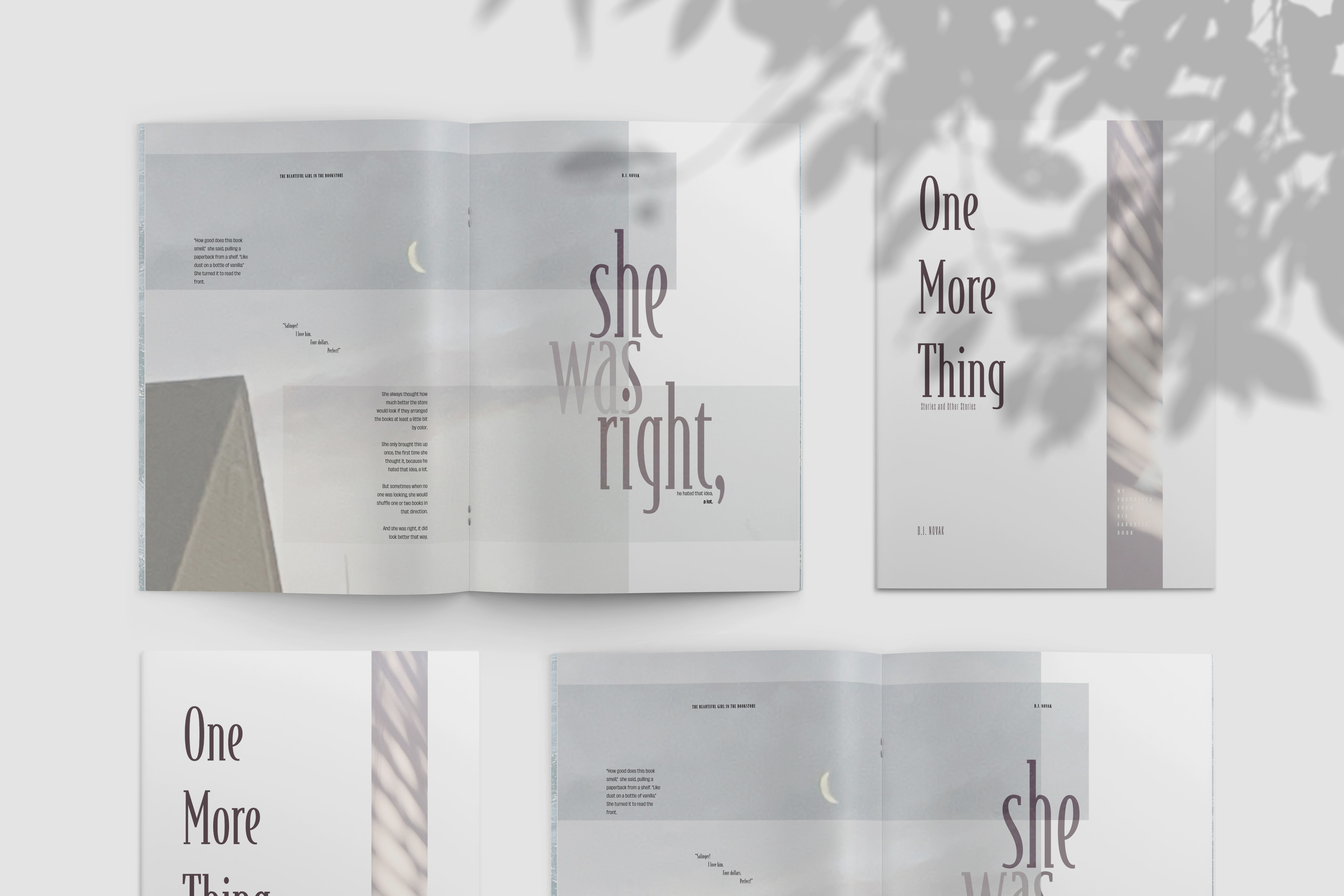 This project is a reimagined interpretation of my favorite book, One More Thing: Stories and Other Stories by B.J. Novak. It explores the gradual deconstruction of two typefaces, with their boundaries and structures dissolving as the pages progress. Eventually, the typefaces take over the imagery, transforming into visual elements themselves. This evolution not only reflects the creative energy of the book but also demonstrates the versatility of the selected typefaces, showcasing their range through various weights and sizes.